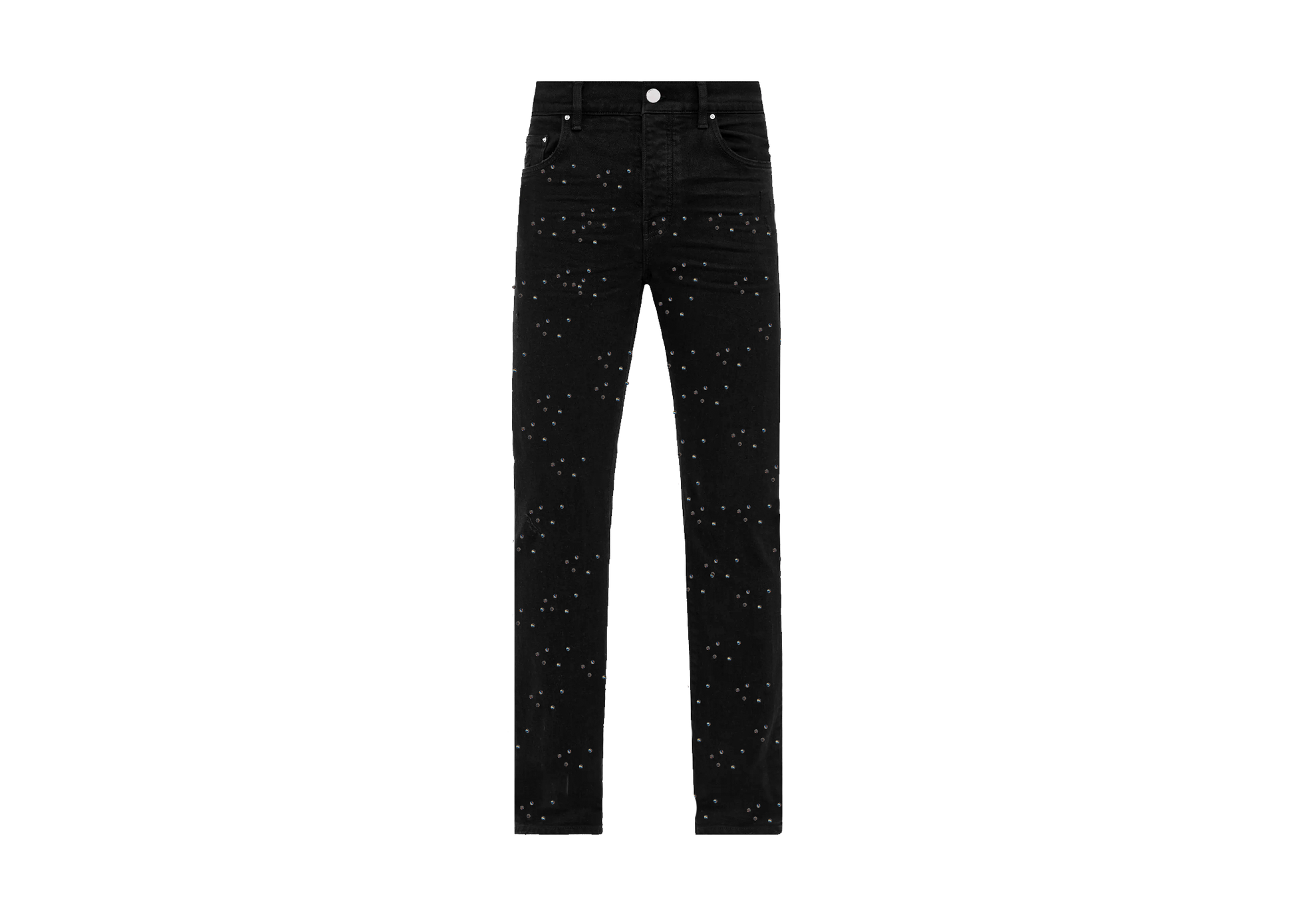 Jet Black New Era style streetwear denim featuring a premium wash and crystal embellishments running down the front and back.